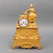 Vuurvergulde bronzen beeldpendule: tuinierende vrouw, Frankrijk, tweede kwart 19e eeuw, adres: C. Detouche, 228-230 Rue St. Martin -tuiniersornament manco, beeldgroep schuin op basement gemonteerd-, 45 x 31 x 11 cm