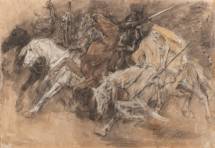 Johannes Hendricus Jurres (1875-1946), koning en ridder te paard met opgeheven zwaard, het Recht en de Dood aan hun zijde, gemengde techniek op papier, gesigneerd, 45 x 65 cm