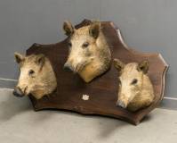 Drie geprepareerde jonge wilde zwijnenkoppen, gemonteerd op houten wandplaat, met messing plaatje: '20-8-1978 Eikensingel Laag-Soeren', 54 x 92 x 43 cm