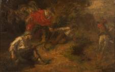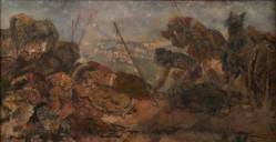 Johannes Hendricus Jurres (1875-1946), krijgers en wenende vrouw buigend over een lichaam op straat, olieverf op paneel, gesigneerd, 29 x 43 cm