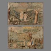 Paar zijden borduurwerken in lijst: geliefden in landschap, 19e eeuw, 23 x 36 cm