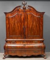 Mahoniegefineerd kabinet op enkelgebogen onderkast, staand op bolklauwpoten, met gesneden kuif van vaas met guirlandes, Hollands, transition, 265 x 203 x 68 cm