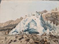 Ingekleurde gravure: 'Vue de la Source de l'Aveiron', door Jean Antoine Linck, 1800-1820 -scheurtje, vouwen, marges afgesneden-, 35 x 47 cm
