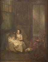 Mogelijk Lambertus Johannes Hansen (1803-1859), vrouw met kind in interieur, olieverf op paneel, gemonogrammeerd -oude vernislaag in delen aanwezig, mogelijk op plekken ingeschilderd-, 34 x 44 cm