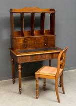 Mahonie schrijfbureau met opstand en uittrekbaar schrijfblad, tweede kwart 19e eeuw -scheur in schrijfblad-, daarbij: beuken bureaustoel, 154 x 96 x 60 cm