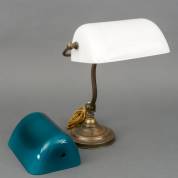 Messing bibliotheeklampje met witte opaline kap, daarbij: groene reservekap -gebruikssporen-, 37,5 cm