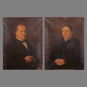 Hollandse School: twee pendantportretten, 'J Stenvers - 58 jaar 1830-1888', en 'Mariana ten Hoove - 57 jaar 1831-1888', beide olieverf op doek, niet gesigneerd -meerdere gaatjes en krassen-, 80 x 60 cm