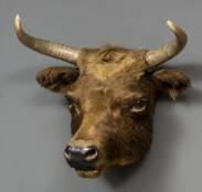 Geprepareerd kopstuk: Salers koe -de huid bij rechteroor en wangen gescheurd-, 55 x 58 x 42 cm