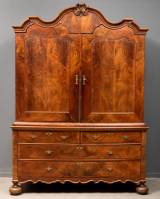 Notenhouten kabinet met gecontourneerde kap en rechte onderkast met vier lades, staande op bolpoten, Hollands, barok, 230 x 170 x 60 cm