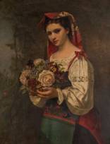 Oostenrijkse School: vrouw in klederdracht met boeket in haar handen, olieverf op doek, tweede helft 19e eeuw, niet gesigneerd, 71 x 55 cm