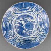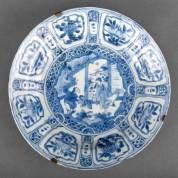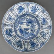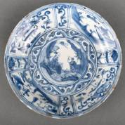 Chinees kraakporseleinen schotel met blauw-wit decor: zittende man en figuur met eend in zijn handen, de rand met vruchten en bloemen in vakverdeling, Wanli -bakfout in rand-, 4,5 x Ø 27 cm