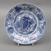 Chinees kraakporseleinen schotel met blauw-wit decor: kostbaarheden, de rand met bloemen en kostbaarheden in vakverdeling, Wanli, Ø 29 cm