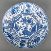 Chinees kraakporseleinen schotel met blauw-wit decor: krekel in landschap, de rand met bloemen en kostbaarheden in vakverdeling, Wanli -randchip van achterzijde-, 6 x Ø 37 cm