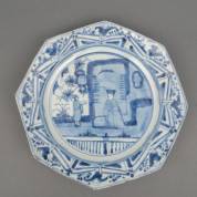 Octagonale Chinees porseleinen schotel met blauw-wit decor: hoogwaardigheidsbekleder en attendant met kistje in zijn handen, de rand met decor van acht zotjes die gongen en bekkens in hun handen hebben, Chongzhen -randschilfers-, 30,5 x 30,5 cm