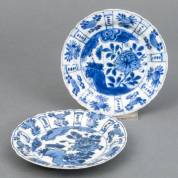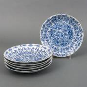 Zes Chinees porseleinen dubbelborden met blauw-wit bloemdecor, gemerkt, Kangxi -vier borden met chips en haarlijnen-, Ø 25,5 cm