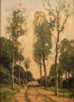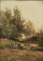 Théophile de Bock (1851-1904), boslandschap met schapen op een landweg, marouflé, gesigneerd, herkomst: veiling Van Marle & Bignell, 27 november 1978, lotnummer 54, 53 x 39 cm
