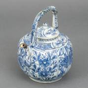 Chinees kraakporseleinen wijnkan met opstaand hengsel en blauw-wit decor: kostbaarheden en bloemen in cartouches, Wanli -tuitje defect, voorzien van metalen reparatie, deksel gechipt-, 19,5 x Ø 14,5 cm