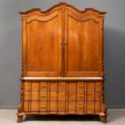 Eiken kabinet met gecontourneerde kap, waaronder twee paneeldeuren, de orgelgebogen onderkast voorzien van drie lades, staande op cabriolepoten, Hollands, 18e eeuw -beslag en sloten vernieuwd-, 209 x 165 x 61 cm