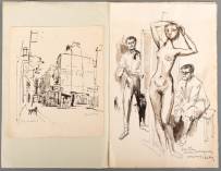 René Wong (1920-1974), twee Oost-Indische inkttekeningen: staand naakt poserend voor de tekenaar, en een impressie van de Rue Mouffetard, Parijs, gesigneerd, 48 x 32 en 27,5 x 32,5 cm