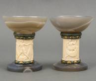 Paar agaten coupes op ivoren stam met verschillende reliëfdecors van dansende vrouwen en groengepatineerde messing monturen, art deco, circa 1920 -één met haarlijn in coupe-, 13 cm