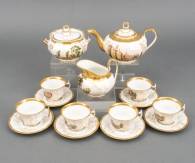 Zespersoons porseleinen theeservies met geschilderde Amsterdamse stadsgezichten, bestaande uit: theepot met gezichten op het Paleis op de Dam en het Felix Meritis, bedekte suikerpot met gezichten op de Muiderpoort en de Weesperpoort, melkkan met gezicht op de Herengracht, en zes kop-en-schotels met gezichten op het Diaconie weeshuis, Portugese synagoge, Amstelbrug, het Hollandse theater, katholieke kerk aan de Singel, en het park, Brussel, circa 1835 -één schotel gelijmd, één kopje haarlijn-, herkomst: collectie Elka Schrijver (1899-1989), Christie's Amsterdam 25 juni 1988, kavel 1 -catalogus bijgevoegd-, 11,5 x Ø 14,5 cm