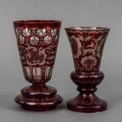 Paar kristallen bokalen met rood en helder überfang decor: de een met jachtscènes, de ander met landhuizen, Bohemen, 19e eeuw, 17 cm