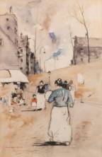 Jan Rijlaarsdam (1911-2007), 'Achterbuurtje', aquarel en zwart krijt op papier, gesigneerd, 49 x 32 cm
