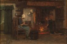 Philip Lodewijk Jacob Frederik Sadée (1837-1904), handwerkende vrouw bij haardvuur, marouflé, gesigneerd en gedateerd 'Ruurlo Sept. '77', 21 x 31 cm