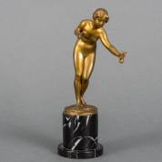 Ludwig Eisenberger (actief circa 1895-1920), verguld bronzen beeld in de vorm van een staande naakte vrouw met vlinder op haar hand, gesigneerd, op zwart marmeren basement, 21,5 cm
