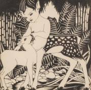 Rie Cramer (1887-1977), fabeldier met hertje in het bos, houtblokdruk, gesigneerd in potlood, 15 x 15 cm