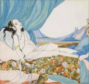 Rie Cramer (1887-1977), liggende naakte vrouw overladen met sieraden, in de stijl van een Arabische sprookje, vermoedelijk ontwerptekening voor een sprookjesboek, aquarel-, gouache- en pentekening op papier, gesigneerd, 17 x 18,5 cm