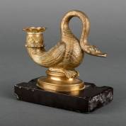Bronzen zwaanvormige blaker, eerste helft 19e eeuw, op Belgisch hardstenen basement, -basement defect en mogelijk niet origineel-, 13 x 13 x 8 cm