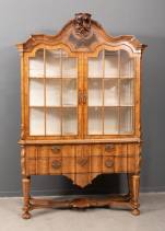Notenhouten porseleinkast, de gecontourneerde kap met rocaillevormige kuif, waaronder een glazen venster en twee deuren met roedeverdeling, de onderkast met drie lades en staande op gefacetteerde poten, verbonden door kruisverbinding, eerste helft 18e eeuw, 212 x 136 x 46 cm