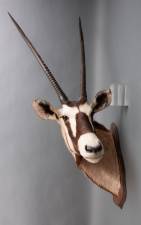 Geprepareerd kopstuk: gemsbok, op houten wandplaat -chipje van de neus-, 140 x 70 x 67 cm