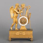 Vuurvergulde bronzen draadslinger beeldpendule: harpspelende Cupido, de opengewerkte wijzerplaat met geëmailleerde ring voorzien van Romeinse cijfers, Frankrijk, 19e eeuw, 36 x 23,5 x 10 cm