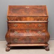 Wortelnotengefineerde dubbelgebogen klepsecretaire, de onderkast met vijf lades, staand op bolklauwpoten, het schrijfcompartiment voorzien van groen vilten werkblad en negen lades met lichte biezen, Hollands, 18e eeuw, 110 x 115 x 60 cm