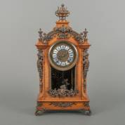 Tafelklok in mahonie kast met messing appliques, de wijzerplaat met geëmailleerde Romeinse cijfercartouches, adres: Stockholder Corporation, Lenzkirch, Duitsland, eind 19e eeuw -één cijfercartouche defect-, 53 x 27 x 18 cm