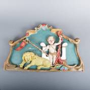 Polychroom beschilderde houten spiegel van een sloep, decor: vaandeldrager met een leeuw aan zijn zijde, 19e eeuw -overgeschilderd, verf bladdert en defecten-, 82 x 42 x 8 cm