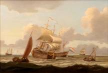 Toegeschreven aan Adam Silo (1674-1760), Nederlandse oorlogsschepen op woelige zee, olieverf op doek, niet gesigneerd, verso gestickerd 'Douwes Fine Art, Stadhouderskade 40' -luchtpartij ingeschilderd, gedoubleerd-, 40 x 59 cm