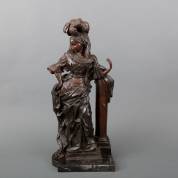 Gepatineerd bronzen beeld: godin leunend op zuil, op zwart marmeren basement, navolger Émile-Antoine Bourdelle -basement gechipt, nagietsel-, 58 x 24 x 19 cm