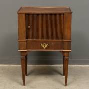 Mahonie pottenkastje met roffeldeurtje en één lade, staand op taps toelopende poten, Louis Seize -onderstel niet origineel-, 70 x 47 xc 31 cm