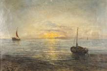 Hendrik Hulk (1842-1937), zeegezicht bij ondergaande zon, olieverf op doek, gesigneerd en gedateerd 1890 -diepe craquelé-, 51 x 75 cm