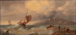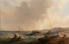 Abraham Hulk (1813-1897), strandgezicht met vissersboten en vissers langs de kust, olieverf op doek, gesigneerd -gedoubleerd, restauraties-, 49 x 74 cm
