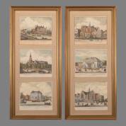 Zes ingekleurde kopergravures in twee lijsten: gezichten op Amsterdam, 18e eeuw, 69 x 31 cm