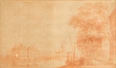 Hollandse School: zicht op 's Lands Zeemagazijn, roodkrijt op papier, 18e eeuw, niet gesigneerd, 18,5 x 31 cm