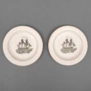 Paar creamware borden met decor van Hollands schip, Engeland, 19e eeuw -gebruikssporen-, Ø 25 cm