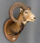 Geprepareerd kopstuk: moeflon, op houten wandplaat voorzien van plaquette 'Ste CECILE 9-10-76', 66 x 35 x 28 cm
