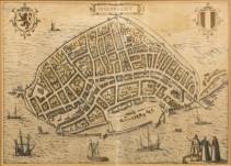 Gravure in lijst: plattegrond Dordrecht, uit: 'Civitates orbis terrarum, in aes incisae et descriptione illustratae', door Braun en Hogenberg, rond 1572 -gebruind-, 34,5 x 48 cm