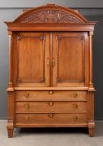 Eiken Drents kabinet, de halfronde kap met gestoken bloemenmand- en bladerdecor, de deuren geflankeerd door zuilen, de onderkast met gecanneleerde zijstijlen met gestoken bloemenmanddecor, Louis Seize, 258 x 174 x 59 cm