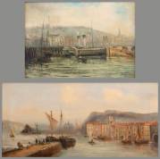 S.A. Galton (19e eeuw), twee werken: havengezicht met figuren -verdoekt-, en havengezicht met stoomraderschip -gaatjes en inschilderingen-, beide olieverf op doek, gesigneerd, 24 x 34 en 19 x 39,5 cm